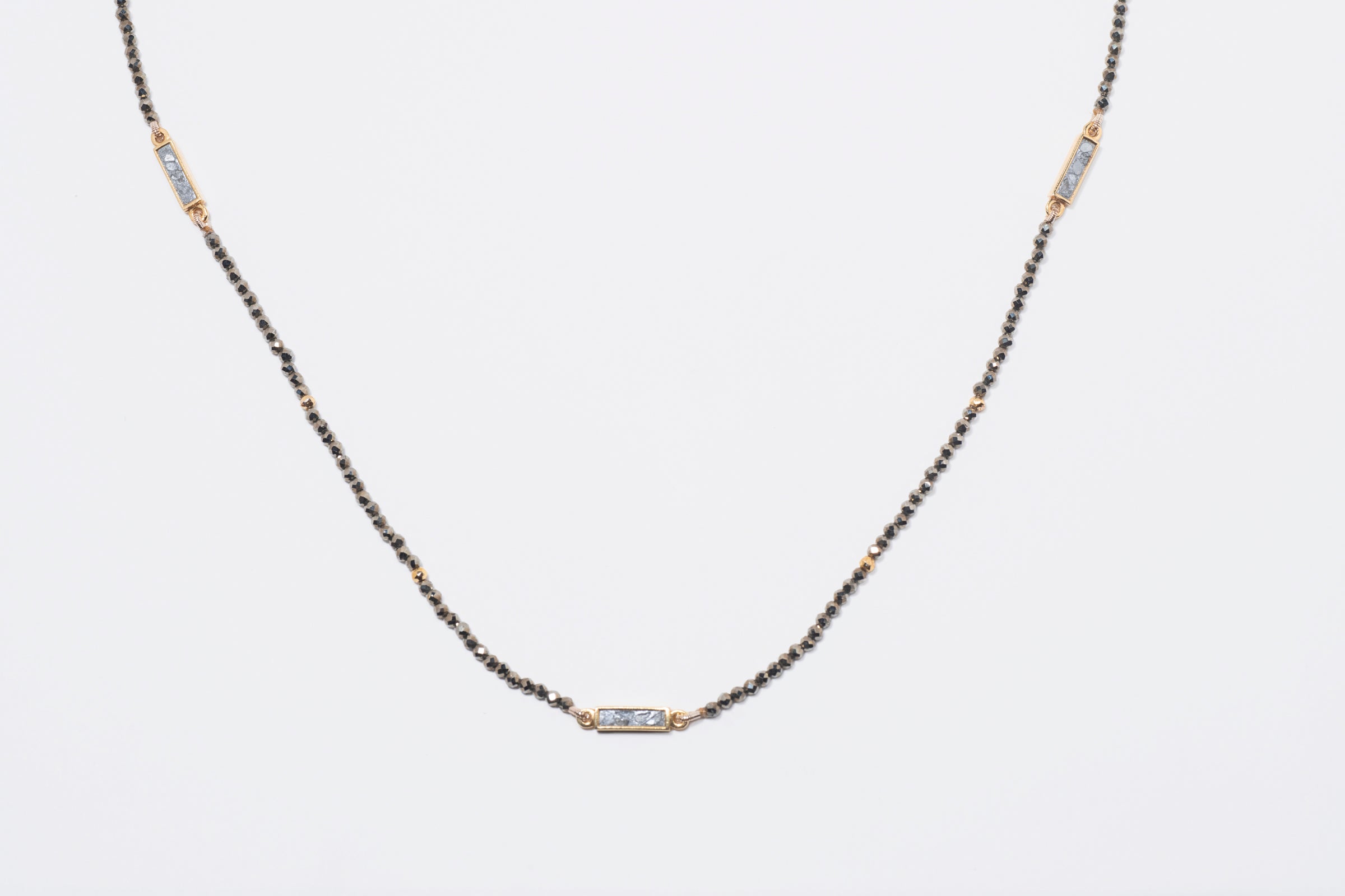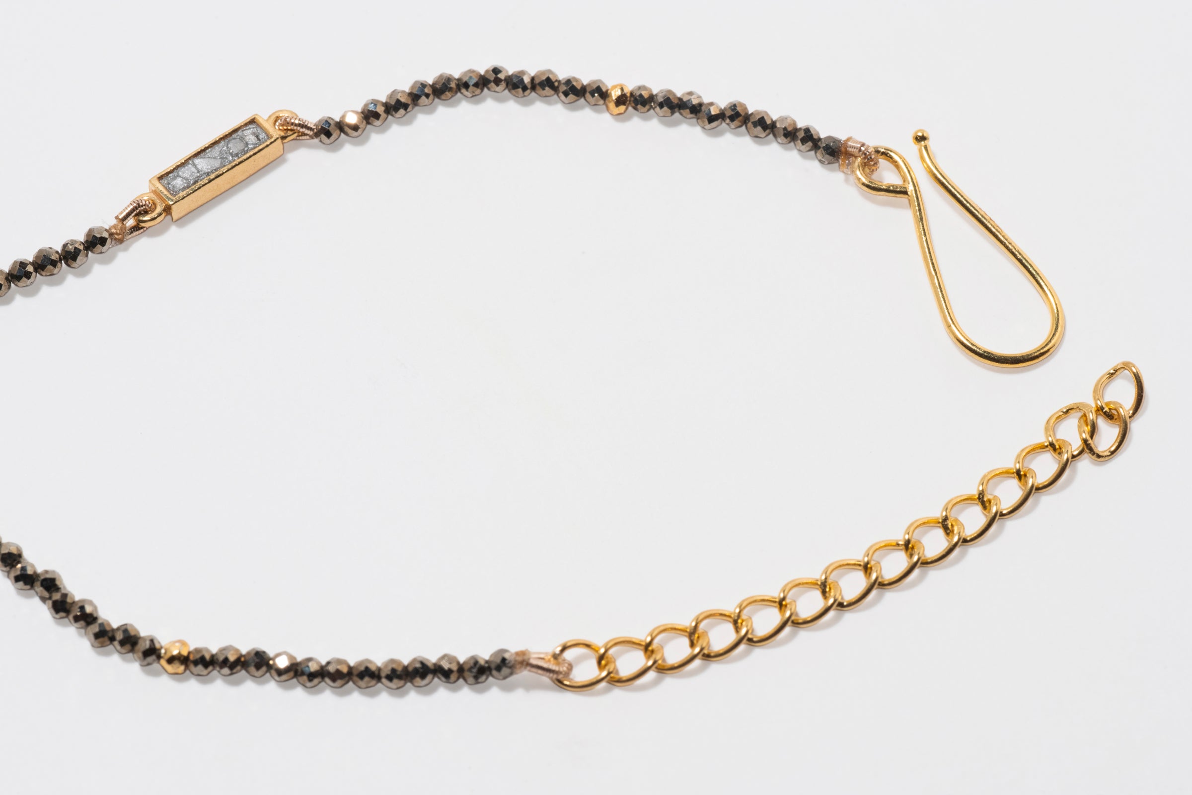 Sliced raw uncut diamonds, Grey pyrite beads, Gold pyrite beads, Silver resin, Vermeil 18k gold