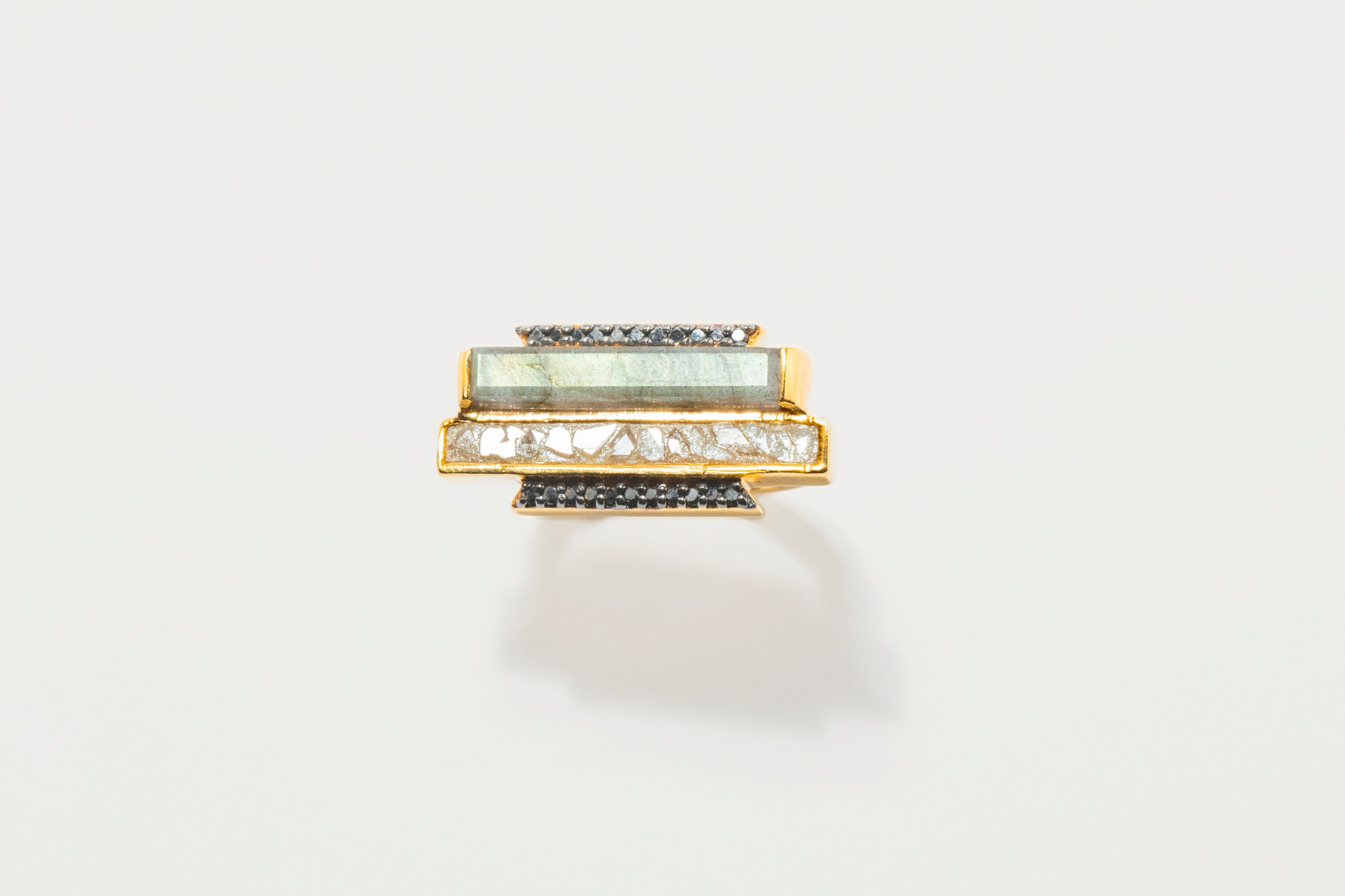 Sliced raw uncut diamonds, Sand resin, Labradorite, Pave black diamonds, Vermeil 18K gold
